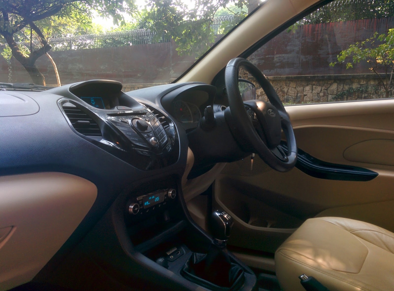 On the inside, the 1.5L TDCi Titanium (Diesel) Figo Aspire comes with dual tone fabric upholstered seats, ample space for four passengers and good cabin insulation that cut out engine noise. There are grab handles for all passengers with integrated coat hooks, vanity mirrors in the front and dual airbags for driver and front passenger. The infotainment screen is missing, and it makes way for a smart phone dock which has an Aux-In and USB port tucked inside. Place your smart phone horizontally and it becomes your infotainment/ navigation screen that displays maps, plays music & makes calls. This variant however, doesn’t have SYNC with voice control.